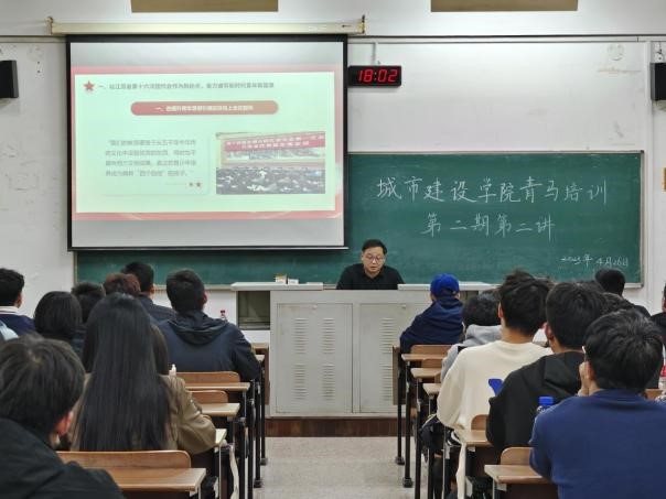 为深入开展学习贯彻习近平新时代中国特色社会主义思想主题教育,进一步加强对青年学生的思想政治引领。tyc7111cc太阳成集团于4月26日晚在W1209开展以“深入学习贯彻党的二十大精神––让青春在火热实践中绽放绚丽之花”的专题报告暨“青马工程”培训班第二期第二讲。本次讲座邀请到校团委书记田轶为主讲人,活动由学院团工作负责人程成老师主持,城建青马工程第二期培训班学员、团干部、入团积极分子到场参加讲座。