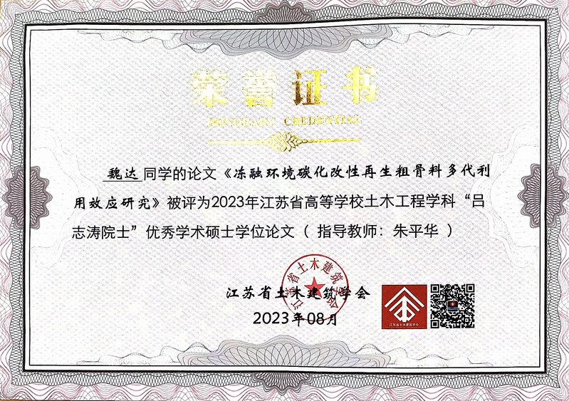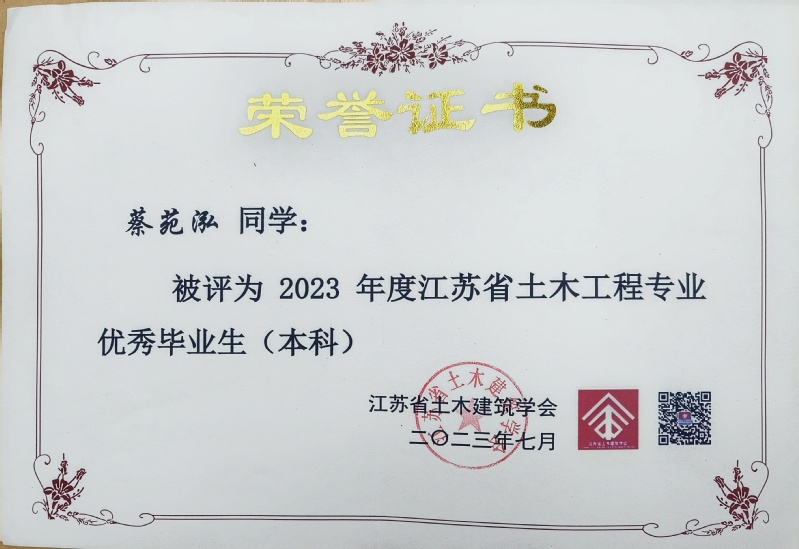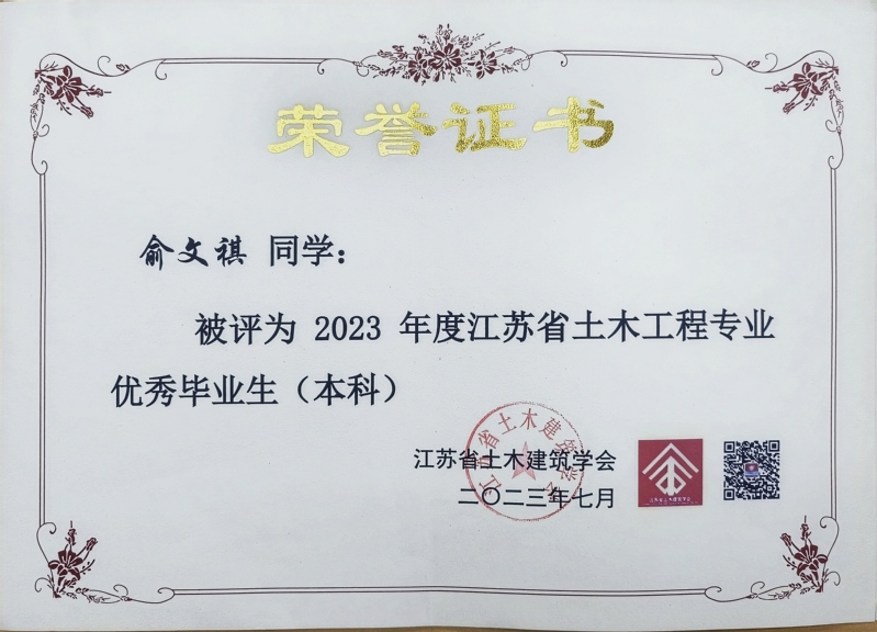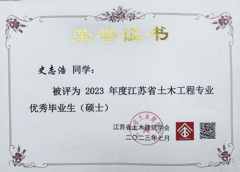 近日,从江苏省土木建筑学会传来喜讯,tyc7111cc太阳成集团2023届本科毕业生土木工程专业俞文祺、蔡苑泓获评“2023年度江苏省土木工程专业优秀毕业生(本科)”,工程管理专业陈一诺获评“2023届江苏省大学生工程管理专业优秀毕业生”,硕士毕业生史志浩获评“2023年度江苏省土木工程专业优秀毕业生(硕士)”。硕士毕业生魏达的毕业论文《冻融环境碳化改性再生粗骨料多代利用效应研究》(指导教师:朱平华)被评为“2023年江苏省高等学校土木工程学科‘吕志涛院士’优秀学术硕士学位论文”。