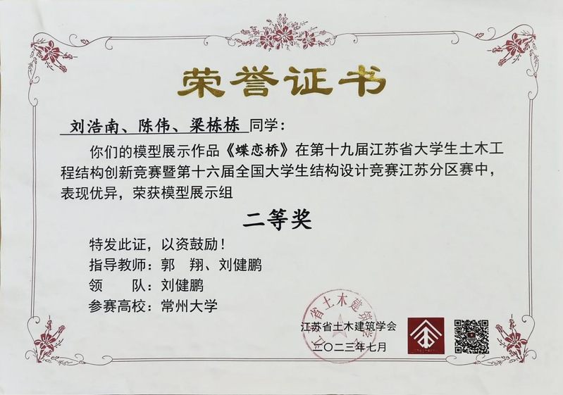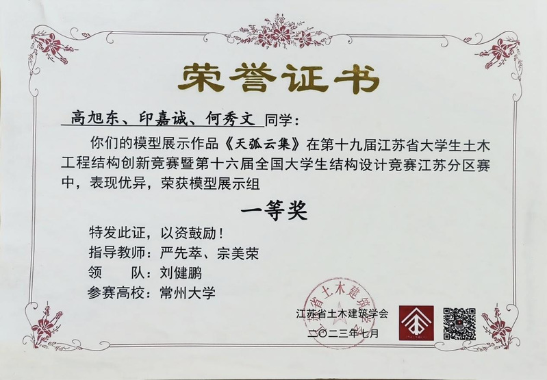2023年暑期,由江苏省土木建筑学会主办、苏州科技大学承办的2023年江苏省大学生土木工程结构创新竞赛暨第十六届全国大学生结构设计竞赛江苏省选拔赛在江苏苏州举办。由我校城市建设学院本科生组成的常州大学代表队获得模型展示组一等奖二等奖1项的优异成绩