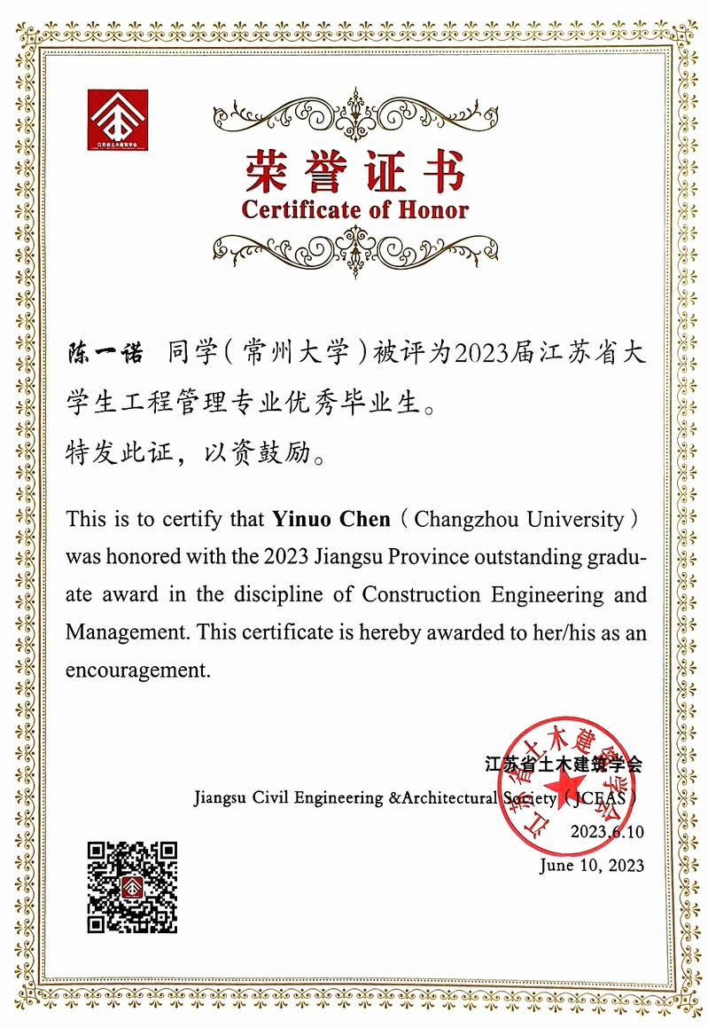 近日,从江苏省土木建筑学会传来喜讯,tyc7111cc太阳成集团2023届本科毕业生土木工程专业俞文祺、蔡苑泓获评“2023年度江苏省土木工程专业优秀毕业生(本科)”,工程管理专业陈一诺获评“2023届江苏省大学生工程管理专业优秀毕业生”,硕士毕业生史志浩获评“2023年度江苏省土木工程专业优秀毕业生(硕士)”。硕士毕业生魏达的毕业论文《冻融环境碳化改性再生粗骨料多代利用效应研究》(指导教师:朱平华)被评为“2023年江苏省高等学校土木工程学科‘吕志涛院士’优秀学术硕士学位论文”。