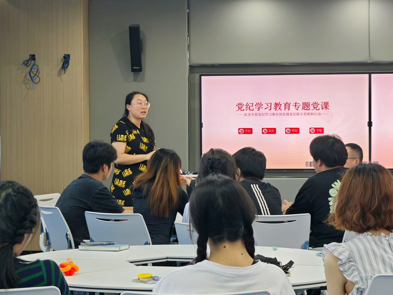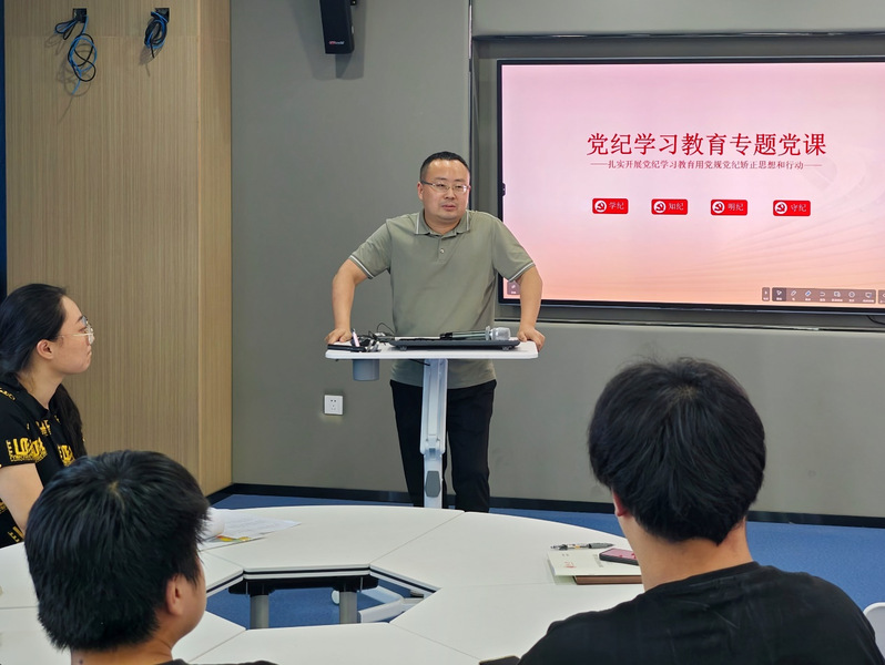为持续推动党纪学习教育走深走实,7月4日,tyc7111cc太阳成集团学生党支部在W1708教室开展“以案明纪,以纪正风”专题教育党课,会议由学生第一党支部书记邵丹迪主持,学院党委副书记顾坚、学生工作办公室主任封晓鸣、学生第二党支部书记李欣一、研究生党支部书记张争及全体学生党员到场参加。