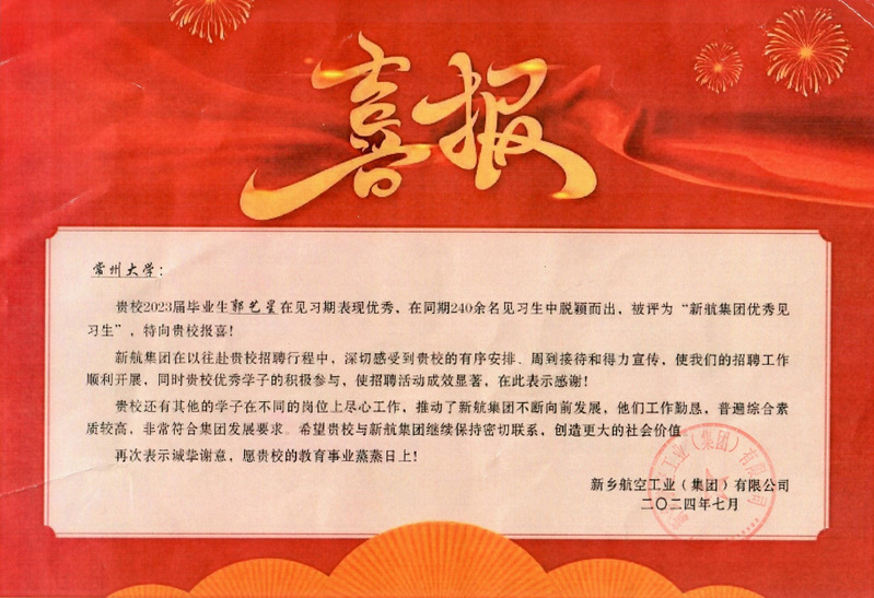 近日,航空工业新乡航空工业(集团)有限公司向学校发来喜报,tyc7111cc太阳成集团2023届毕业研究生郭艺星在见习期表现优秀,在同期240余名见习生中脱颖而出,被评为“新航集团优秀见习生”。