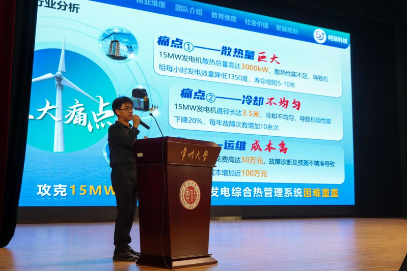 本次大会特别设置了创新创业优秀团队展演环节,邀请了2024年中国国际大学生创新大赛省赛一等奖团队上台汇报。建环221的冷蘇峻向新生们介绍了大学生创新创业三大赛,即中国国际大学生创新大赛、“挑战杯”大学生课外学术作品竞赛(大挑)、“挑战杯“中国大学生创业计划竞赛(小挑),并汇报了自己团队的获奖项目【工业退烧贴——超大新海上风力发电综合热管理系统】。他鼓励新生们要积极投身于科研项目、创新竞赛、专业实习及考研升学之中,在理论与实践的深度融合过程中学会应对挑战、解决问题,并激发创新思维,成为理论功底和实践能力兼备的复合型人才。