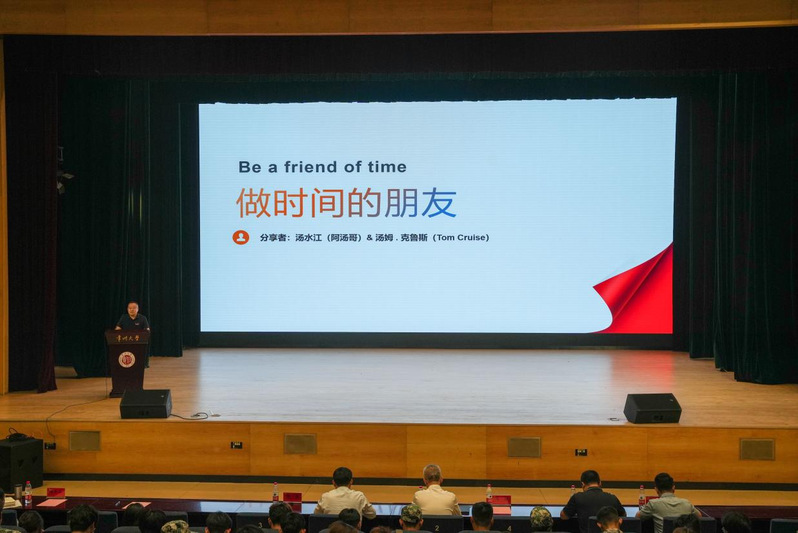 讲座上,汤水江以“做时间的朋友”为主题,分别从青春奋斗、认知能力、运动锻炼、学习习惯、热爱生活和长期主义六个方面,和新生分享自己的奋斗史和人生感悟。在演讲过程中,汤水江积极与台下同学互动,使整个讲座变得趣味盎然。接着,汤水江播放了自己公司新奇环保有限公司的宣传视频,里面介绍了公司的基本情况和发展方向,极大地激发了同学们对未来职业生涯的向往和憧憬,并强调了选择好平台与适配职业的重要性。最后,汤水江衷心祝愿新生们能提高个人竞争力,在新一轮科技革命和产业变革深入发展的时代,立足专业,追求卓越。