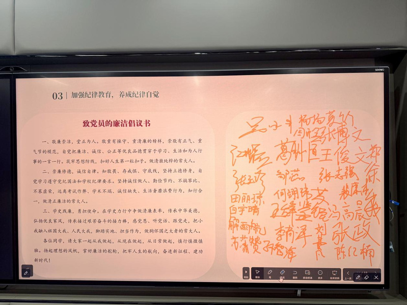 活动伊始,邵丹迪总结回顾了《党章中的纪律》展览,强调纪律严明是党的光荣传统和独特优势。廉洁自律是党员干部的基本素质,是党风廉政建设和反腐败斗争的重要保证。随后,全体同学共同观看了“醒廉”纪录片。该纪录片通过真实的职务犯罪案例,展示了腐败现象的严重危害以及全面从严治党的坚定决心和显著成效。纪录片中,鲜活的案例让人触目惊心,也让大家深刻认识到廉洁自律的必要性和紧迫性。观看过程中,同学们聚精会神,深受触动,纷纷表示要以此为鉴,时刻保持清醒头脑,坚守廉洁底线。