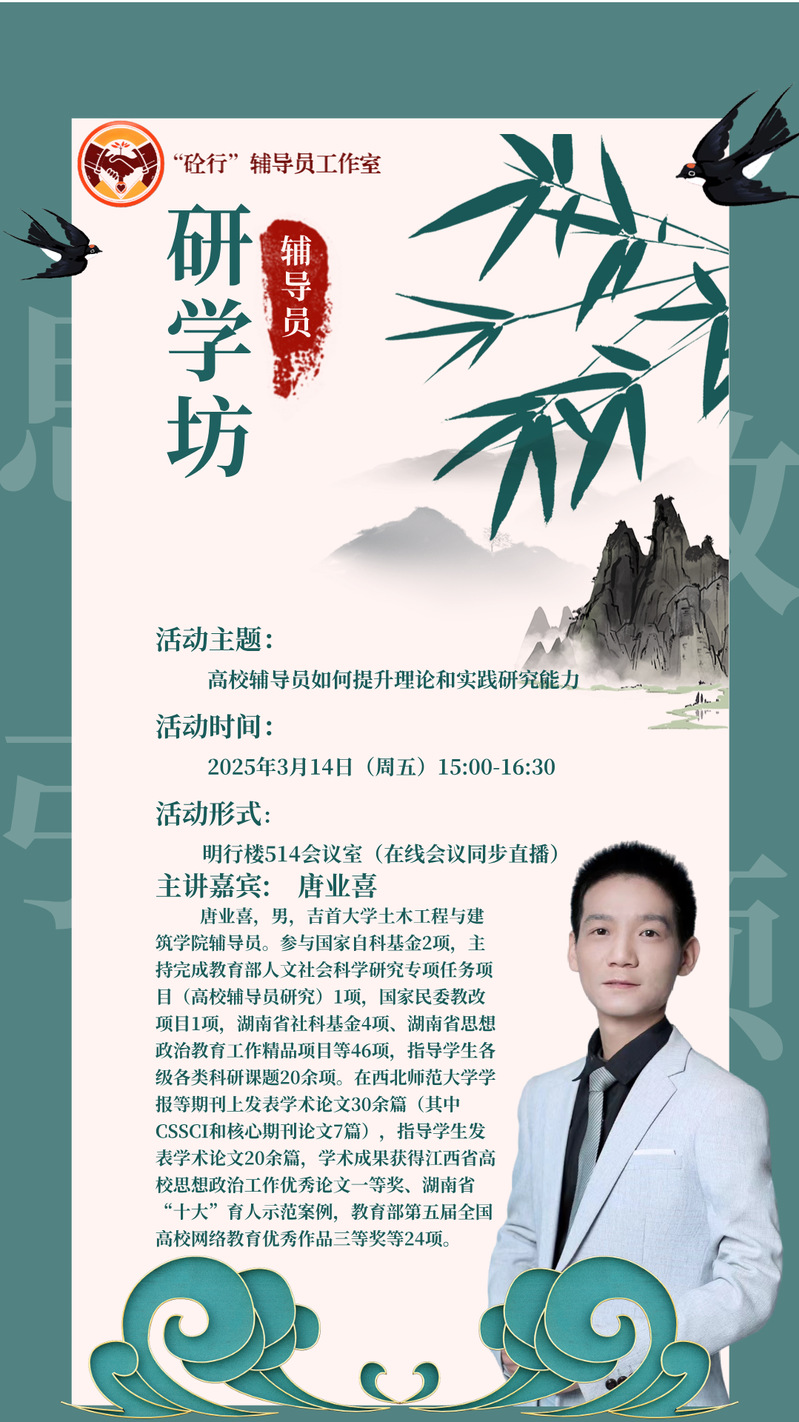 2025年3月14日下午,太阳成tyc7111cc砼行辅导员工作室与常州纺织职业技术学院生·长思政工作室在明行楼514联合举办辅导员研学坊活动。活动通过校际交流、专家讲座等形式,聚焦新时代辅导员队伍科研能力提升,共探思想政治教育创新发展路径。
