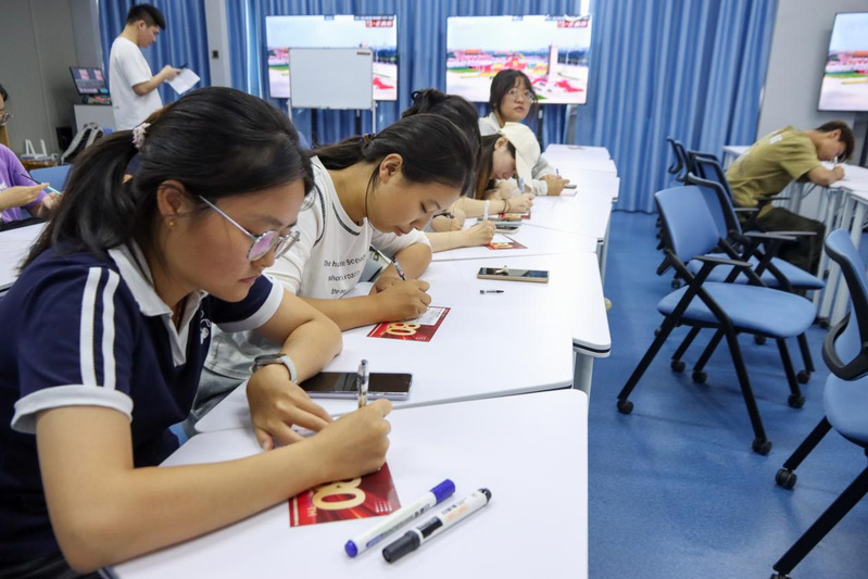 习近平总书记的重要讲话深刻阐释了抗日战争的历史意义和时代价值,强调要铭记历史、珍爱和平、开创未来。阅兵仪式正式开始。空中护旗梯队率先通过,党旗、国旗、军旗引领方向。26架直升机组成“80”字样,3架悬挂“正义必胜、和平必胜、人民必胜”标语,气势磅礴 。受阅装备方阵中,国产现役主战装备体系化亮相,新域新质力量与战略威慑力量的模块化呈现,空中梯队涵盖预警指挥、歼击、轰炸等多型主战机型,让在场师生直观感受到国防和军队现代化的历史性跨越。本次阅兵是推进中国式现代化新征程的首次阅兵,也是人民军队奋进建军百年的崭新亮相,宣示铭记历史、珍爱和平、捍卫胜利成果的坚定决心。观礼后,师生们拿起笔,在特制卡片上认真作答,从“回望历史”“和平寄语”到“强国有我”三个维度,抒发内心感悟。