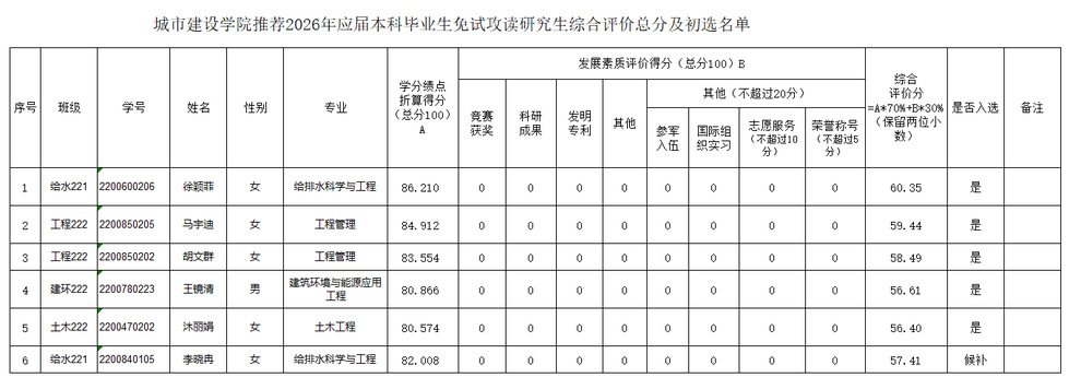 【公示】tyc7111cc太阳成集团推荐2026届本科毕业生免试攻读硕士研究生初选名单公示