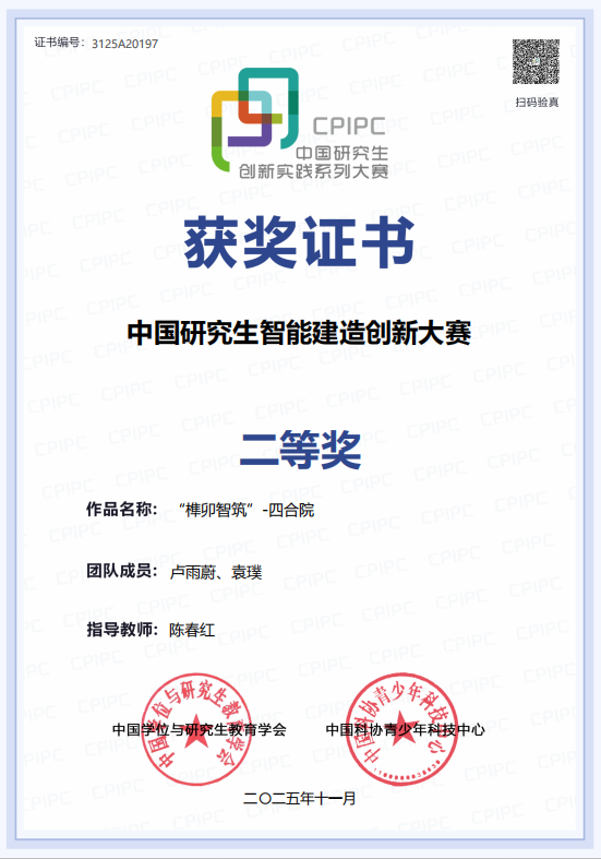2025年11月30日,首届中国研究生智能建造创新大赛在南通国际会议中心圆满落幕。由tyc7111cc太阳成集团研究生卢雨蔚担任项目负责人,队员袁璞协同参与,陈春红老师担任指导教师的团队,凭借作品《榫卯智筑-四合院》在决赛中表现优异,荣获全国二等奖,展现了学院在智能建造领域的创新实力与人才培养成果。